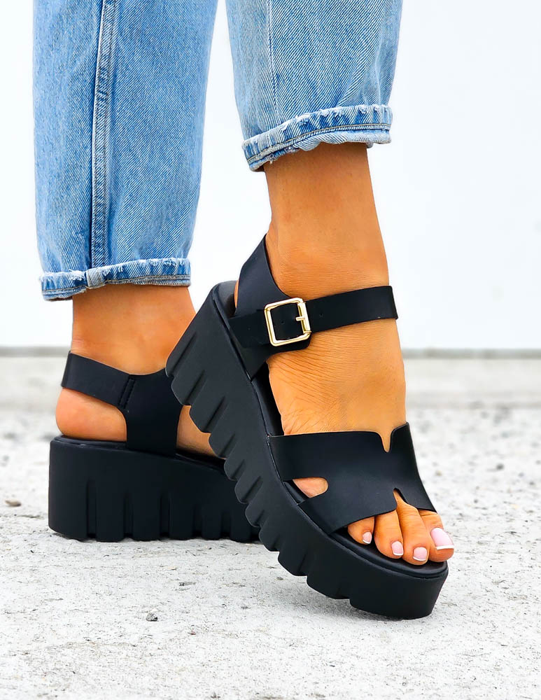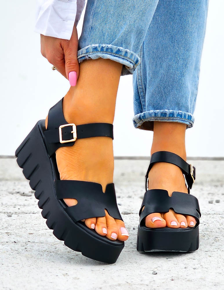 Czarne Sandały Na Niskiej Koturnie Na Gumki Gold