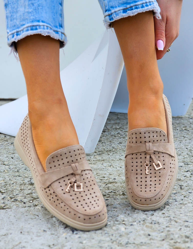 Eleganckie, beżowe, zamszowe mokasyny na lekkim podwyższeniu w ażurowy print