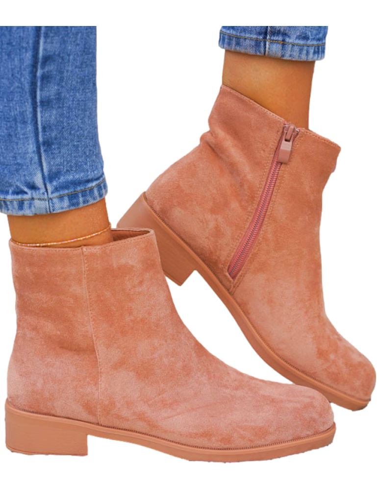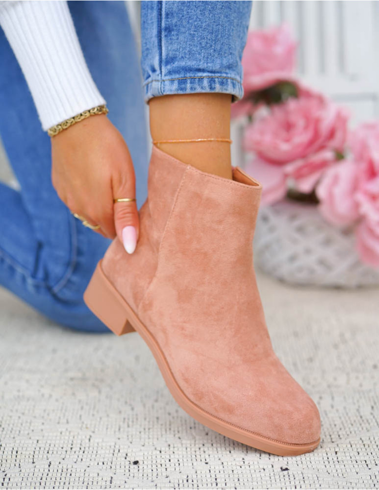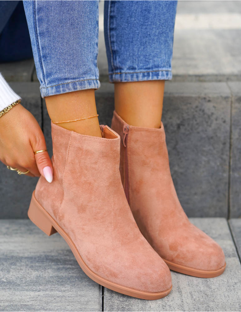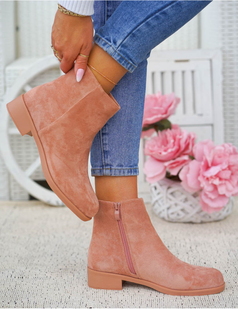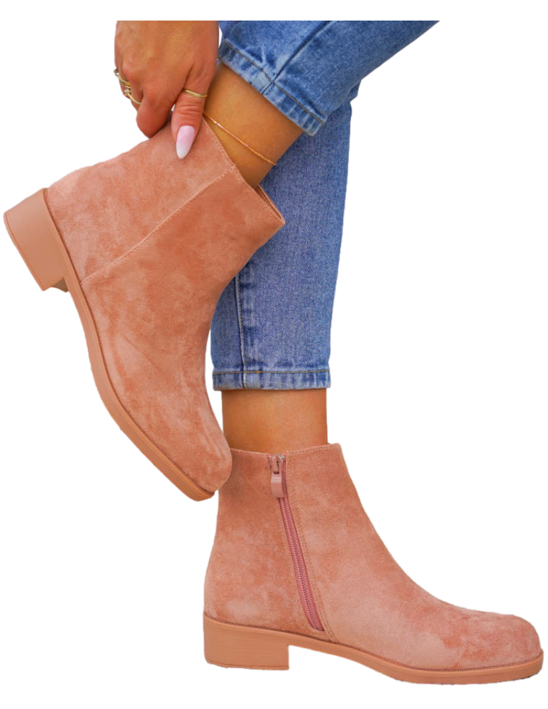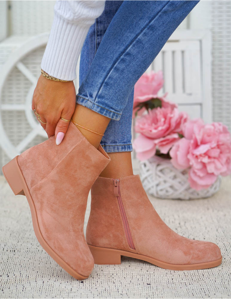 Pudrowe Zamszowe Botki Na Płaskim Spodzie Prima