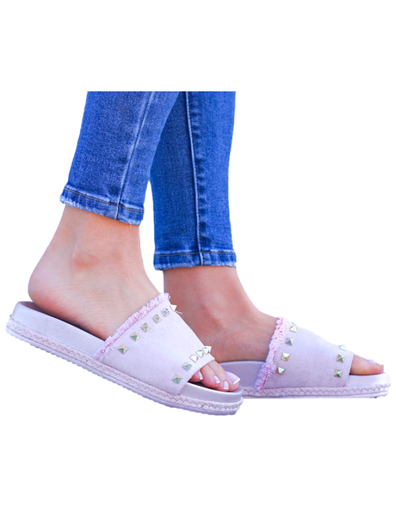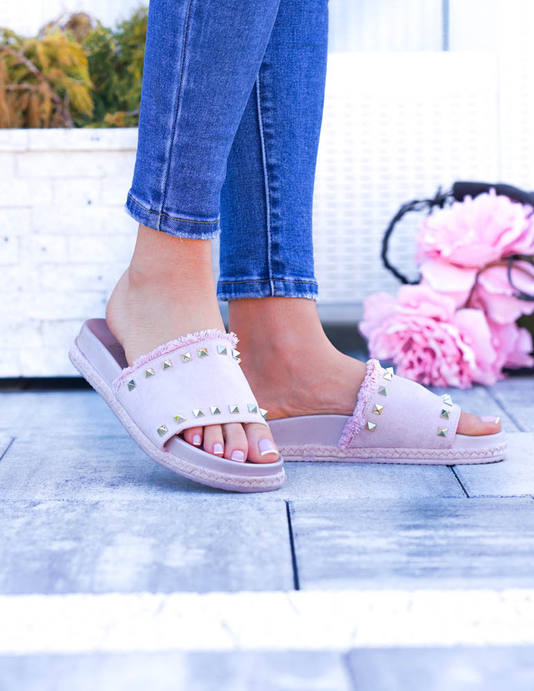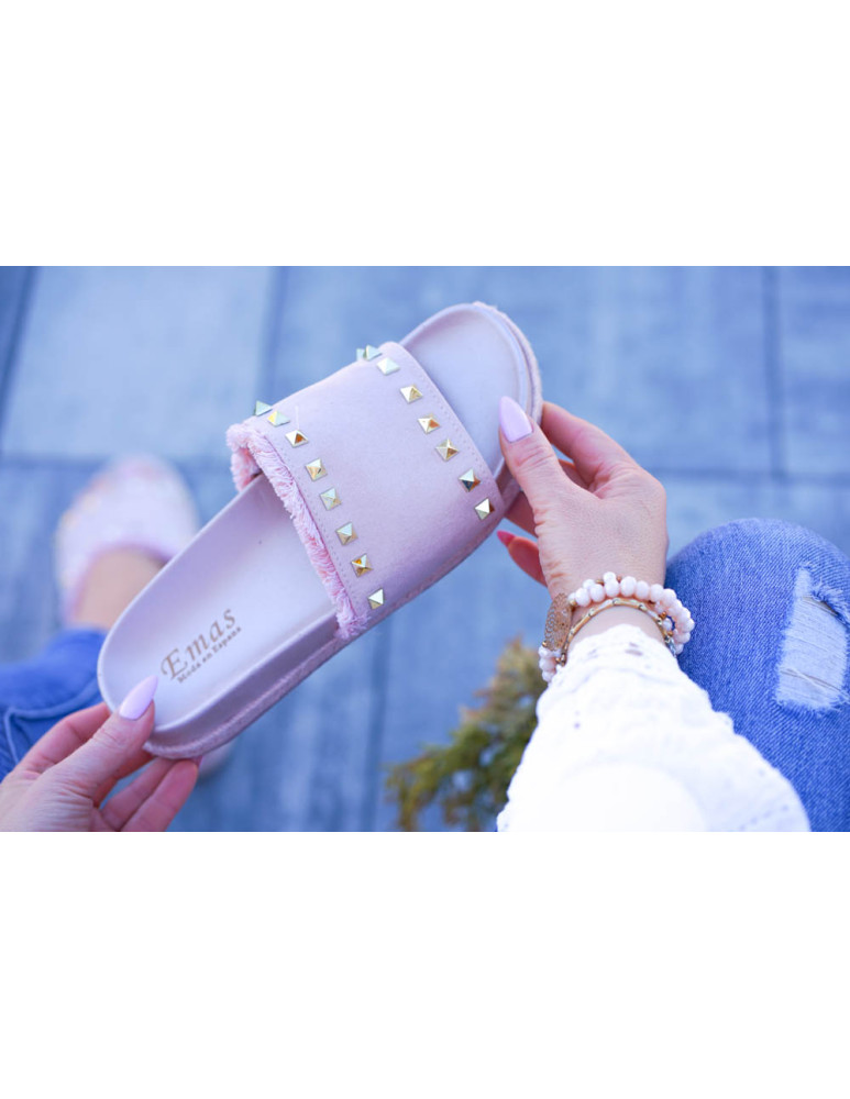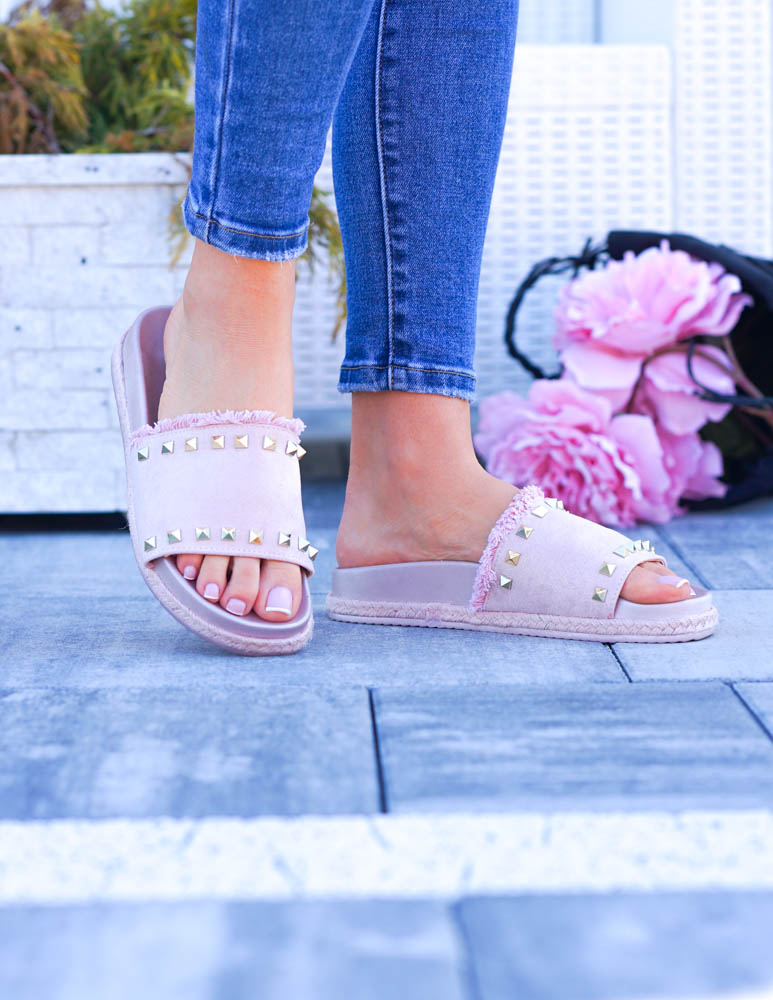 ❤Różowe klapki z ćwiekami i frędzelkami w styli boho