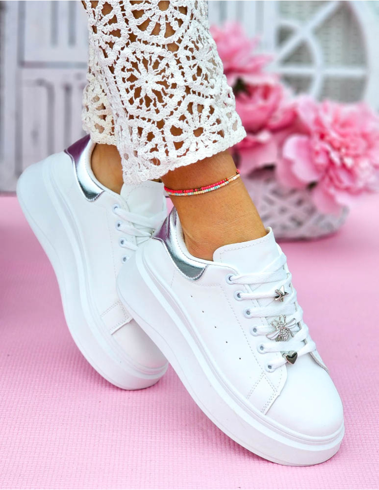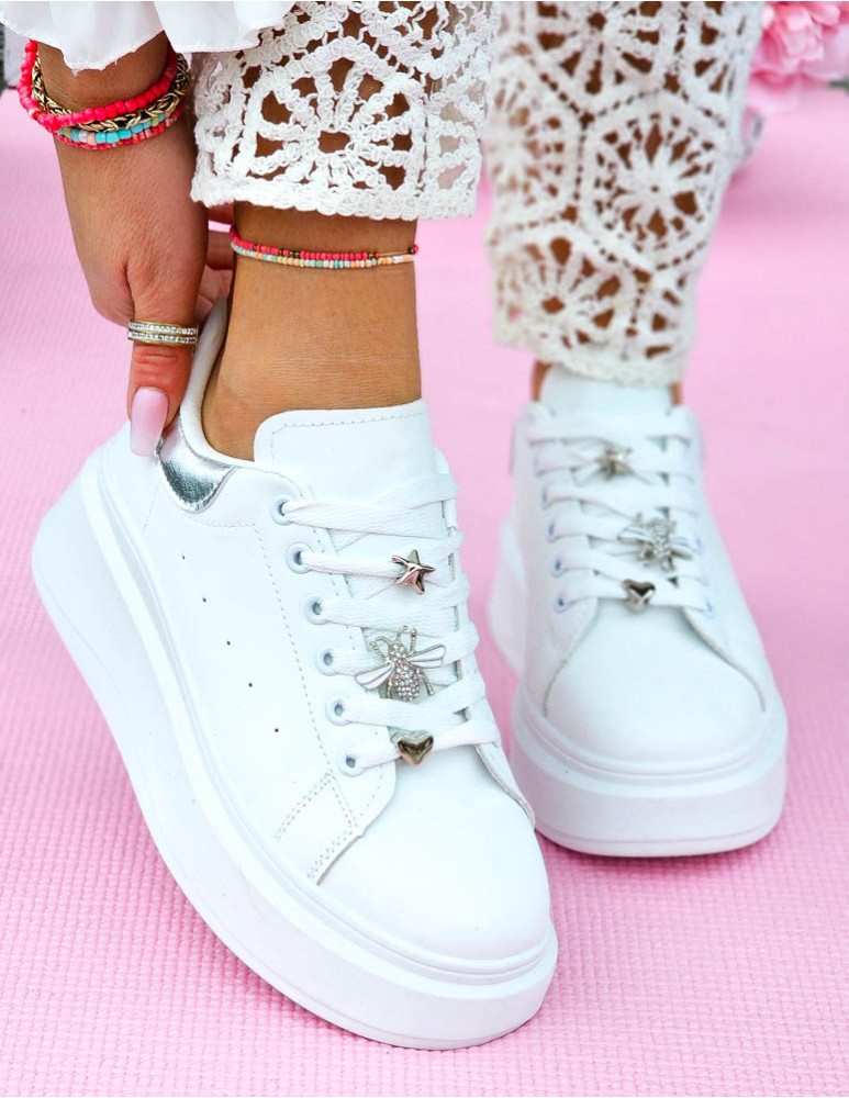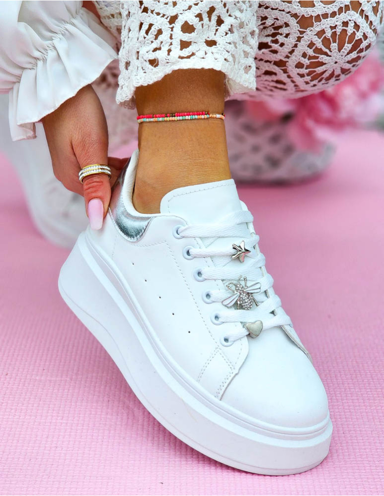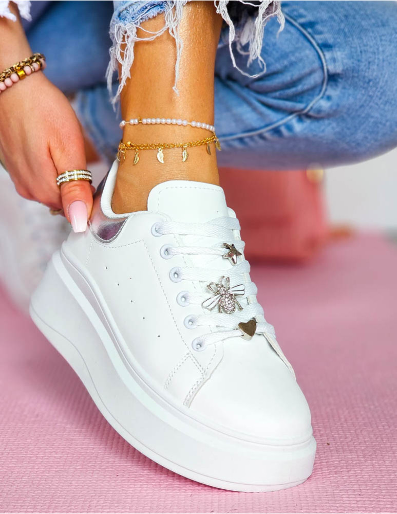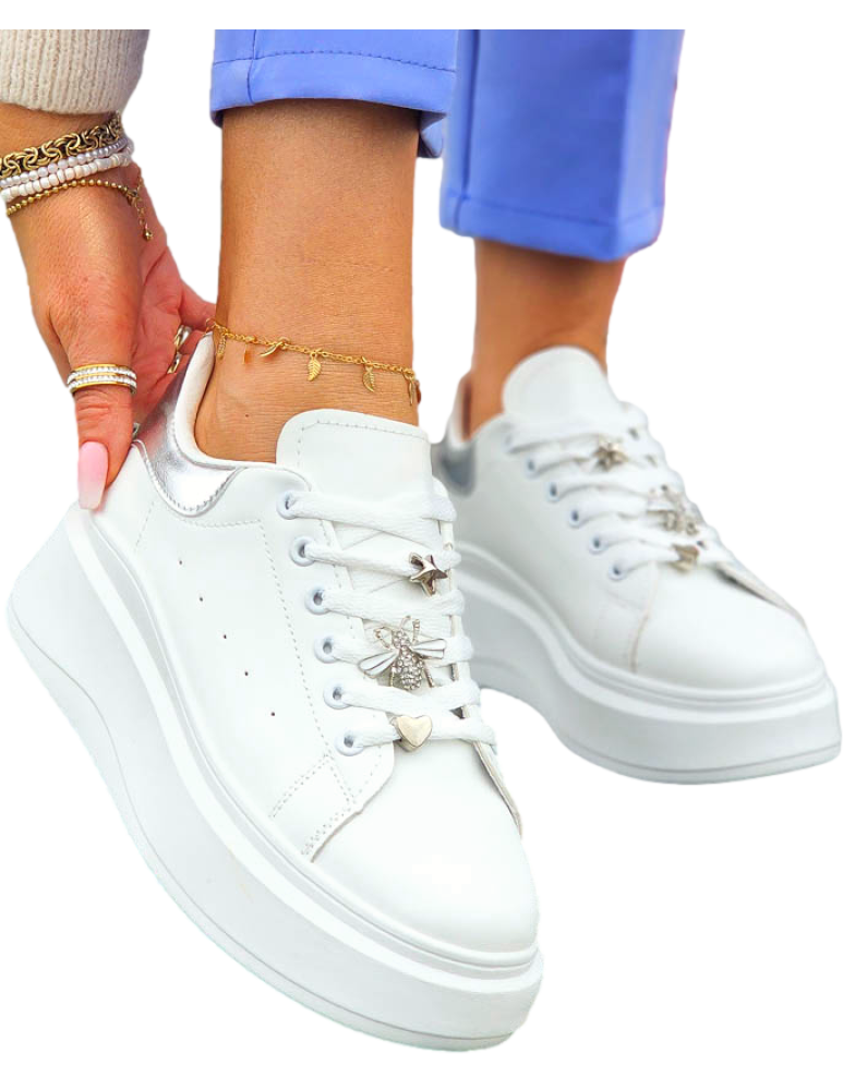 Modne, białe adidasy ze skóry ekologicznej. Buty posiadają subtelne, srebrne ozdoby na sznurowkach