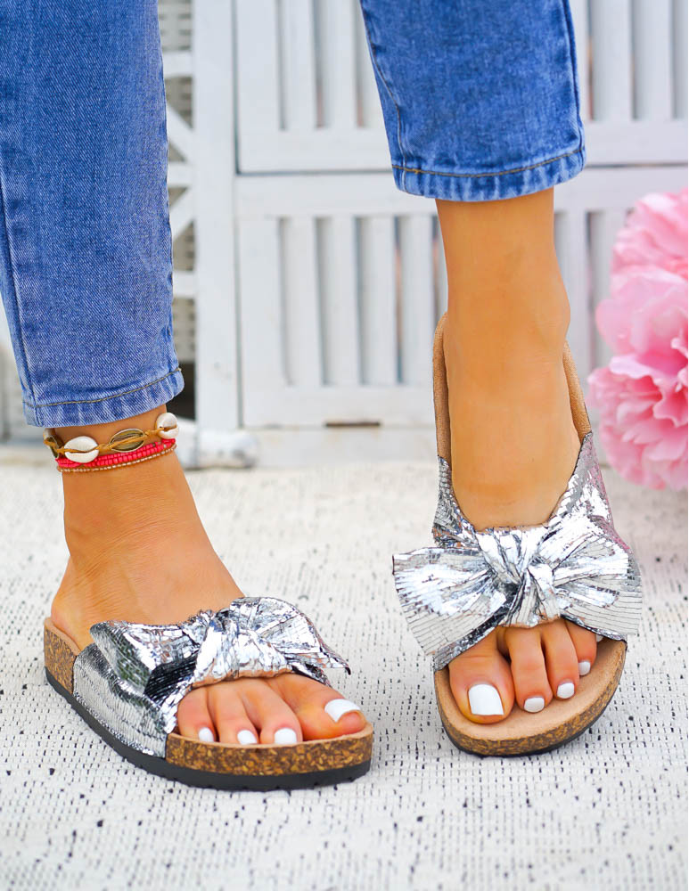 - Kod produktu: Srebrne Profilowane Klapki Z Kokardą Shein