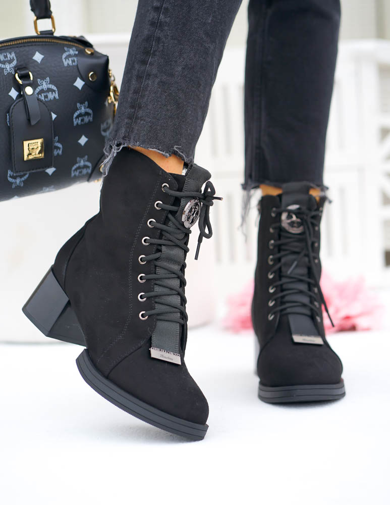 Krótkie Czarne Zamszowe Botki Na Koturnie Save