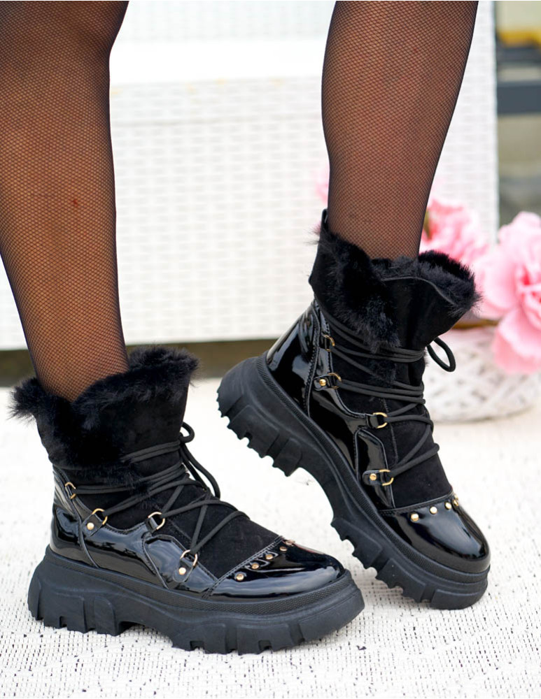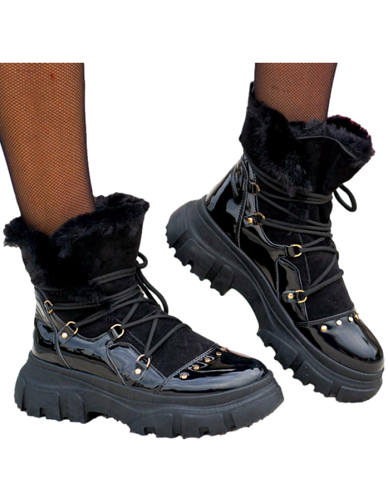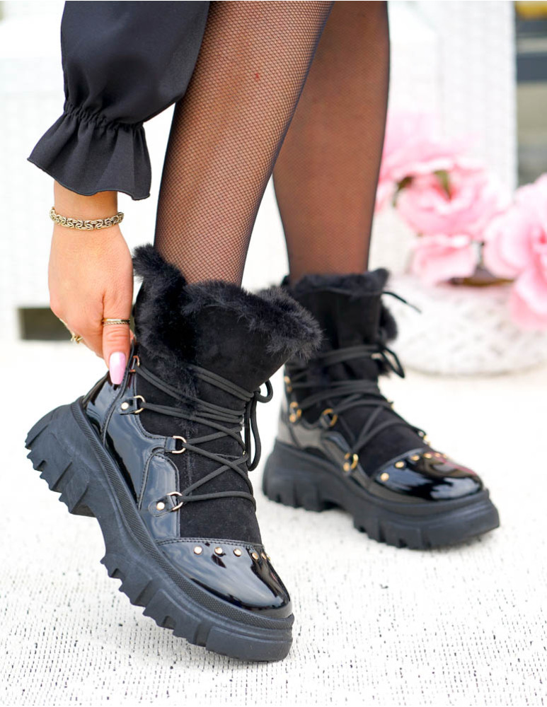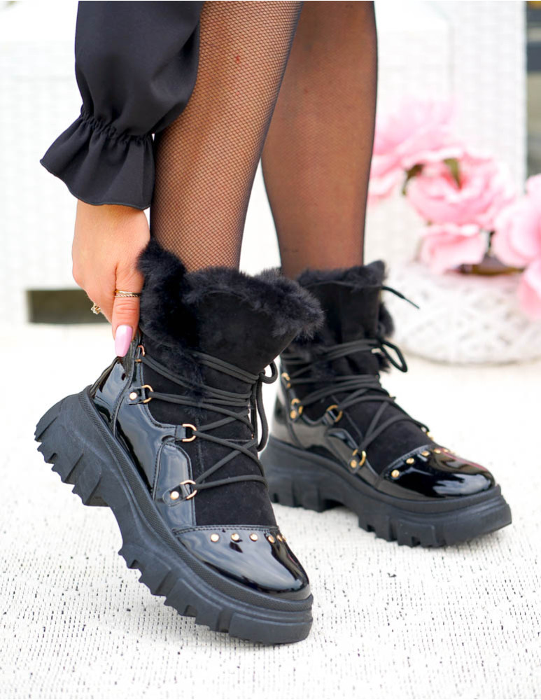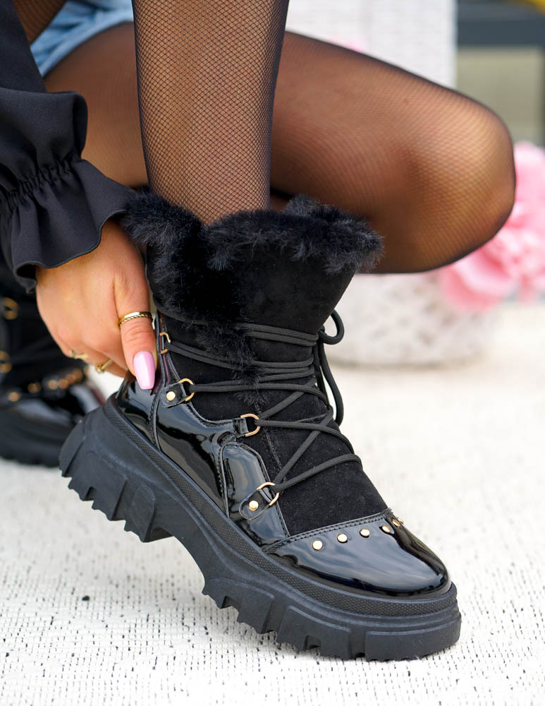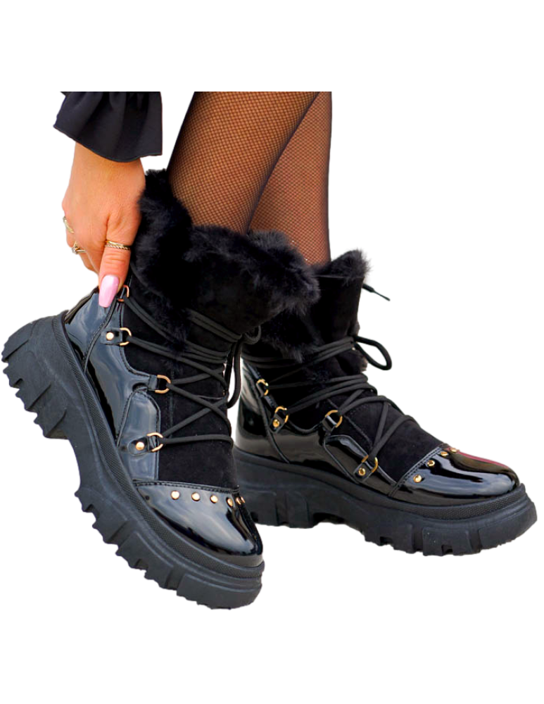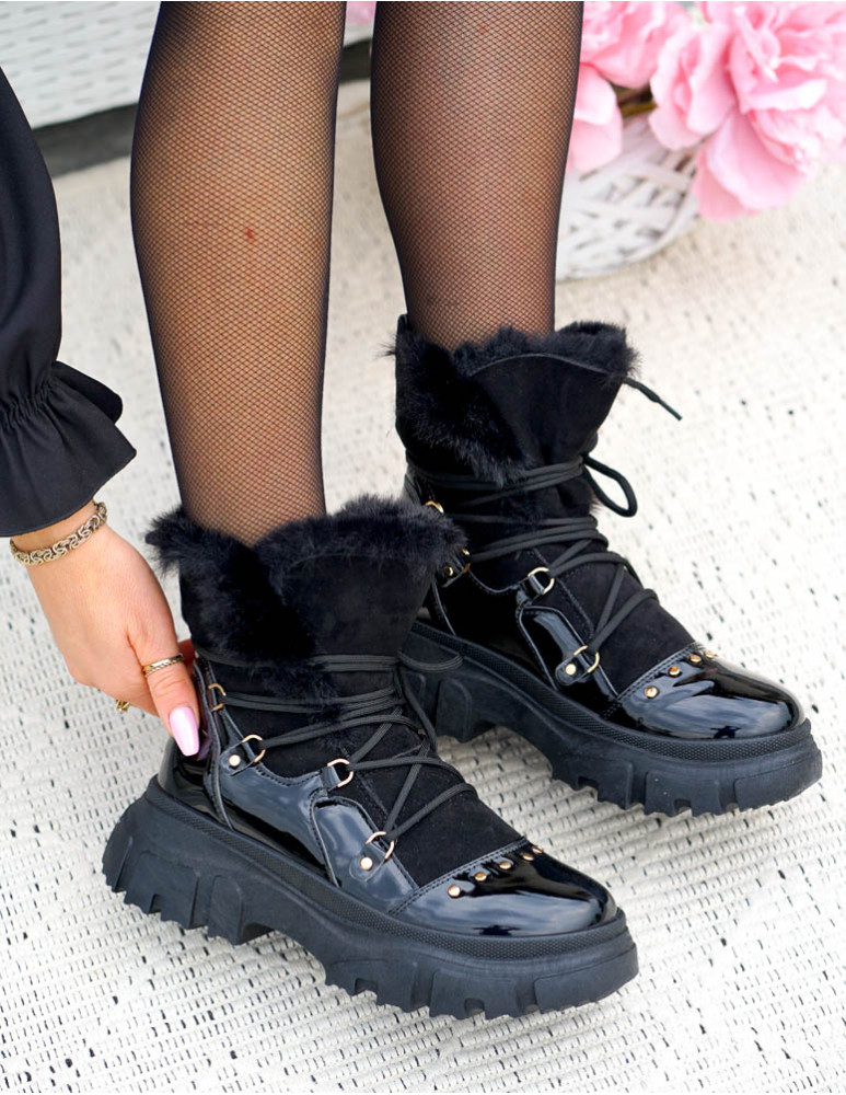 Czarne, bardzo ciepłe  trapery damskie na zimę. Buty wykonane są z eco skóry zamszowej oraz lakierowanej. Ocieplane grubym, miłym futerkiem