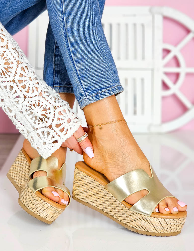 Złote Klapki Damskie Na Koturnie Comfort Renei